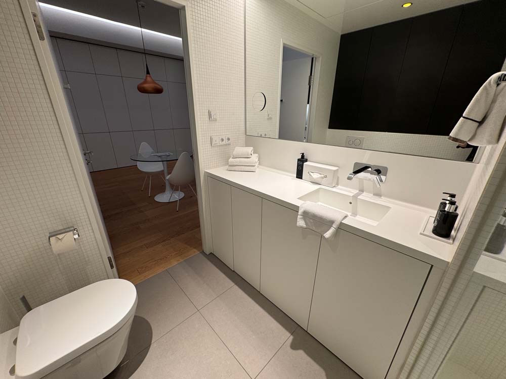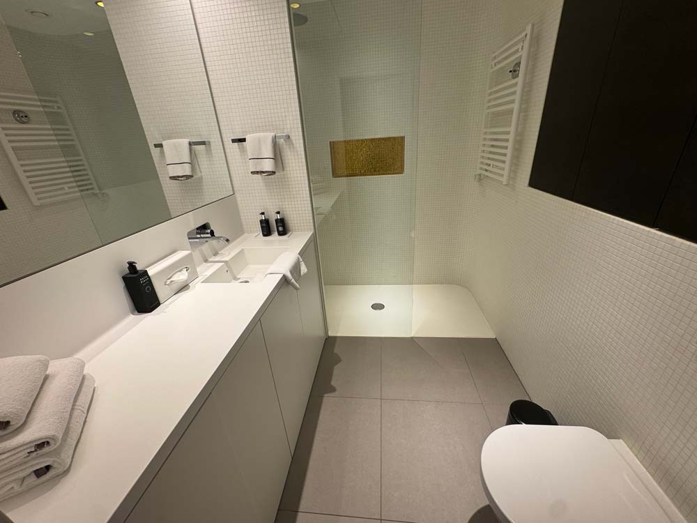 Modernes Badezimmer mit großer, begehbarer Dusche, eleganter Spiegelfläche, WC und reichlich Stauraum
