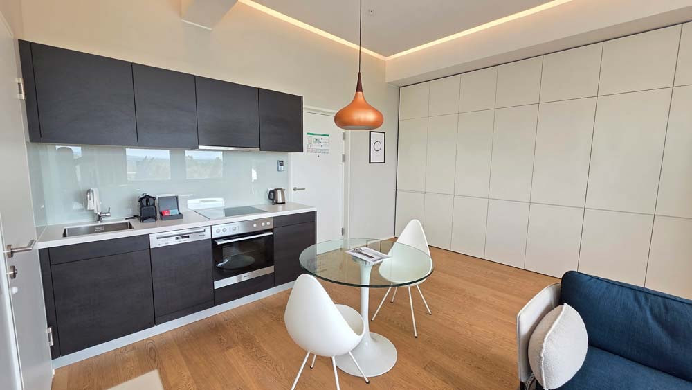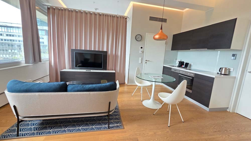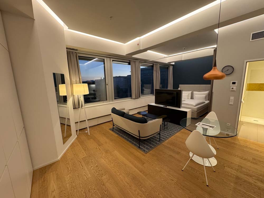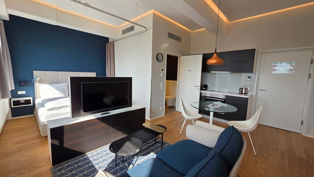 Großzügiger Wohn-/Schlafbereich mit gemütlichem Doppelbett, stilvoller Möblierung und viel Stauraum