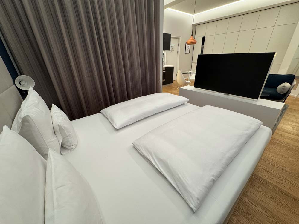 Flat-TV, edle Parkettböden & hochwertige Vorhänge runden das geschmackvolle Ambiente ab